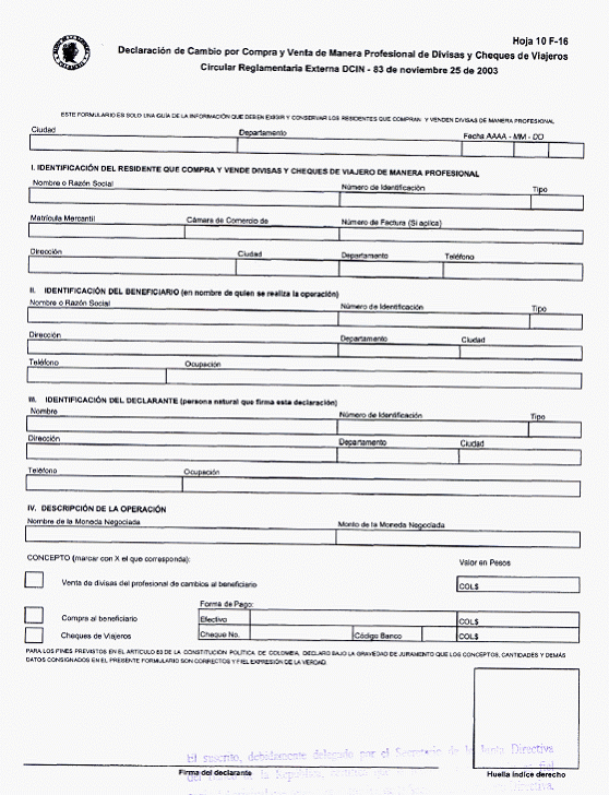 9.2.4.- Posteriormente, con la Circular Reglamentaria Externa DCIN – 83 del 21 de noviembre de 2003, el Banco de la República dispuso como obligación de los Profesionales Cambiarios exigir a sus clientes una declaración de cambio que contenga como mínimo la información prevista en el “Formulario de Declaración de cambio por compra y venta de manera profesional de divisas y cheques de viajero”, cuando la operación sea igual o superior a quinientos dólares de los Estados Unidos de América (US $ 500), o su equivalente en otras monedas: