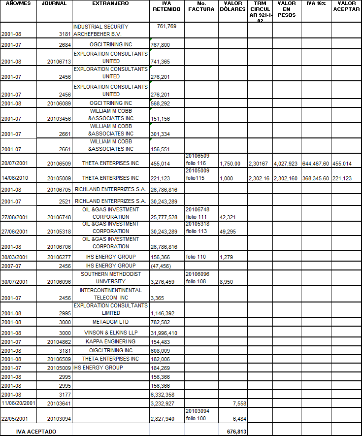 Puso de presente que anexó copia de las declaraciones de retención en la fuente, presentada por los meses de julio y agosto de 2001, así como una relación que especifica los valores retenidos por cada una de las transacciones que dieron lugar al IVA registrado en la contabilidad, junto con sus respectivas facturas de soporte.