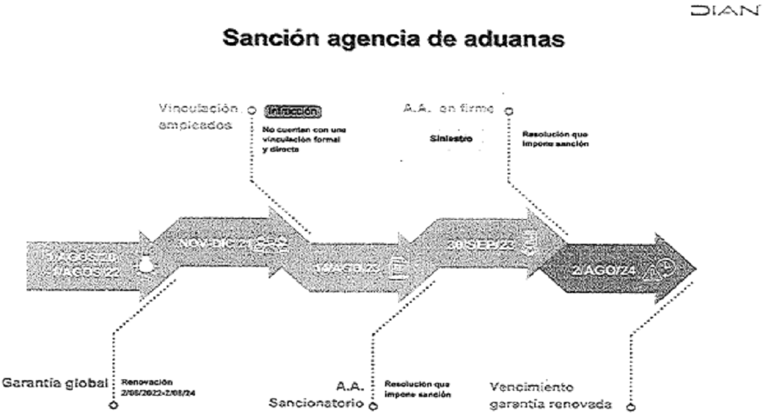 La Dirección Seccional de Aduanas de Bogotá sancionó a la Agencia de Aduanas TRES Nivel 1 mediante la Resolución 2232 del 14 de agosto de 2023 con multa de $36.401.000 por la comisión de la infracción establecida en el numeral 2.5 del artículo 622 del Decreto 1165 de 2019 porque para los meses de noviembre y diciembre de 2021 no tenía vinculados a sus empleados de manera directa y formal, y ordenó hacer efectiva la póliza de cumplimiento de obligaciones legales No. 22222 expedida por la Compañía de Seguros PRIS, a favor de la Nación UAE - Dirección de Impuestos y Aduanas Nacionales de manera proporcional en la cuantía señalada. Este acto sancionatorio fue notificado el 15 de agosto de 2023.