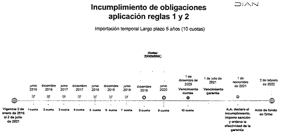 La Dirección Seccional de Buenaventura, el 1 de noviembre de 2021 declaró el incumplimiento de las obligaciones del pago de las cuotas 8 y 9, impuso la sanción prevista en el numeral 1.1. del artículo 616 del Decreto 1165 de 2019 por la suma de $20.000.000 debido a que no pago oportunamente las cuotas de los tributos aduaneros y ordenó hacer efectiva la garantía No. 43324 certificado No. 0 expedida por SEGUROS COLOMBIA SOL S.A., por las cuotas y la sanción mediante la Resolución 2822.