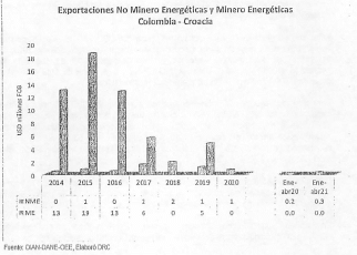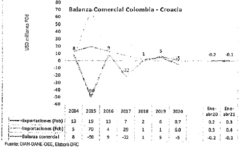 - La balanza comercial de Colombia con Croacia ha sido tradicionalmente positiva, pero durante el año 2015 se registró el primer déficit. En 2017 la balanza comercial registró su segundo déficit correspondiente a USD 21,8 millones, en razón al aumento de las importaciones por la compra de barcos.
