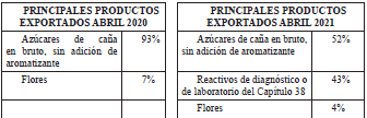 - Entre enero-abril de 2021 las exportaciones fueron de USD 294 mil, presentando un aumento de (88%) respecto al valor registrado en el mismo periodo del año 2020, en esencia, debido a las mayores ventas de reactivos de diagnóstico o de laboratorio del capítulo 38, (100%) al pasar de USD 0 a USD 127 mil y de azúcares de caña, en (6%) al pasar de USD 145 mil a USD 154 mil y, en menor proporción flores.