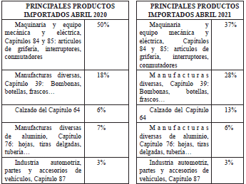 - Para el mismo período de 2021 las importaciones alcanzaron los USD 358 mil, las cuales registraron un aumento del (3%) frente al valor registrado durante el mismo periodo del año 2020, debido en esencia a las mayores ventas de recipientes, botellas, bombonas, recipientes de plástico, del Capítulo 39, (57%) al pasar de USD 63 mil a USD 99 mil; calzados para deportes y suelas de caucho, Capítulo 64 en (134%) al pasar de USD 20 mil a USD 48 mil.