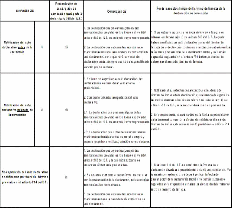 19. Es necesario mencionar los siguientes supuestos en los cuales, habiéndose subsanado las inconsistencias contempladas en los literales a) y d) del artículo 580[15] del E.T., se ha notificado o no un auto declarativo, para evidenciar las implicaciones en cada caso respecto al conteo del término de firmeza de dicho denuncio fiscal
