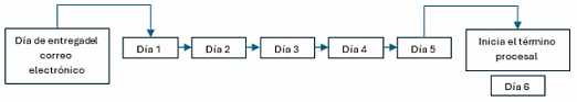 8. Sin embargo, mediante Auto del 10 de octubre de 2025, Expediente 25000-23-37-000-2022-00528-01 (28923), el Consejo de Estado concluyó que el término de cinco (5) días comenzaría a correr a partir del día siguiente de la entrega del correo electrónico[2]. A continuación, se incluye una gráfica que ilustra este entendimiento: