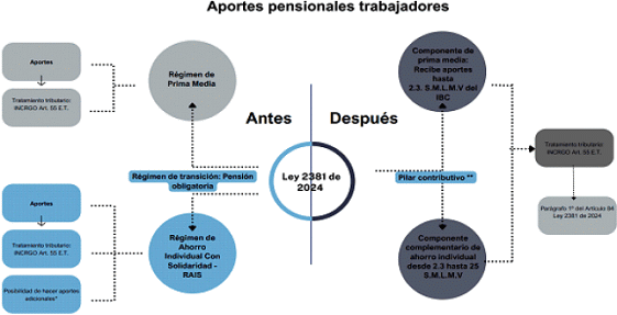 17. Siendo así, toda vez que la Ley 2381 de 2024 modifica la Ley 100 de 1993 en lo pertinente[9], sin perjuicio del régimen de transición allí consagrado, una lectura armónica de la norma permite concluir que, para la procedencia de la deducibilidad de los salarios es requisito acreditar la realización de los aportes obligatorios en el sistema pensional, tal y como los que se lleguen a efectuar en el componente complementario de ahorro individual del pilar contributivo.