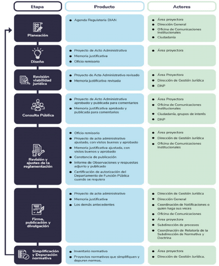 5. Que el ciclo reglamentario comprende siete etapas: la primera (1) corresponde a la inclusión de los proyectos normativos en la Agenda Reglamentaria DIAN. Esta será administrada por la Dirección General y prevé la participación ciudadana al ser sometida a consulta pública por el término de 10 días calendario.