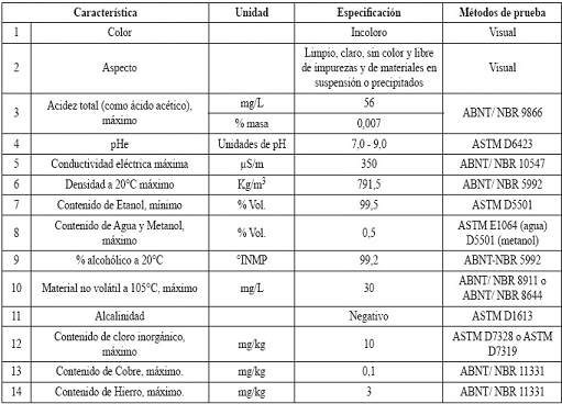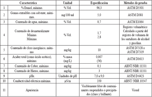 TABLA 1. Parámetros de calidad del etanol anhidro combustible utilizado como componente oxigenante de gasolinas.