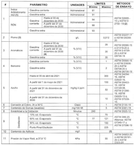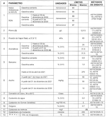 (1) A partir de 1 de mayo de 2021 el octanaje se definirá con términos del parámetro RON. A partir del 1 de mayo do 2021 el parámetro IAD será en términos de “reportar” al Ministerio de Minas y Energía, donde IAD = (RON+MON)/2