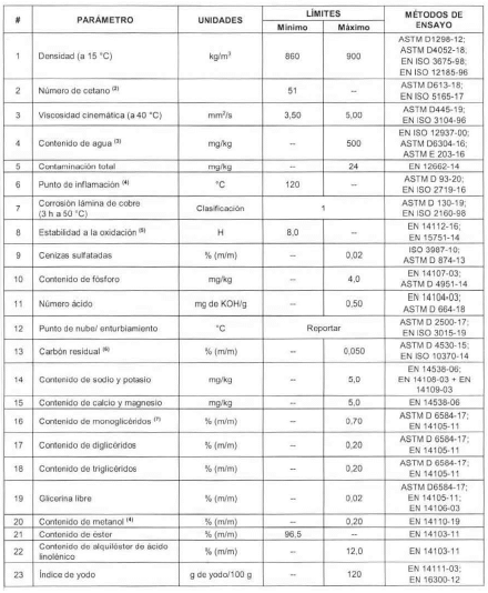 (1) Las especificaciones de la Tabla 3A de la presente Resolución son las que debe cumplir el biocombustible entregado por el productor y el importador de biodiésel para su mezcla con el diésel de origen fósil.