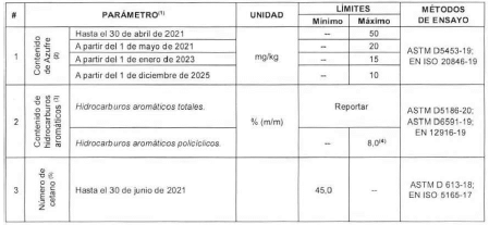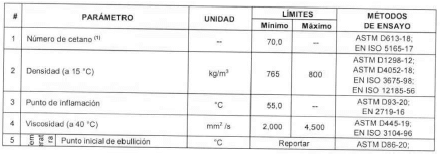 (5) Como alternativa de medición se pueden emplear los métodos ASTM D6890-18, ASTM D8183-18, ASTM D7170-16, EN 15195-14 y EN 16144-12, en los cuales se determina el Número de Cetano Derivado. En caso de disputa con cualquiera de estos métodos alternativos, se deberá emplear el método bajo las normas ASTM D 613 o EN ISO 5165-17. En todo caso, para el método ASTM D613-18 se establece un rango de tolerancia de± 1,5. Para la entrega al distribuidor mayorista, el límite mínimo es 46,5 ±1,5 a partir del 1 de julio de 2021.