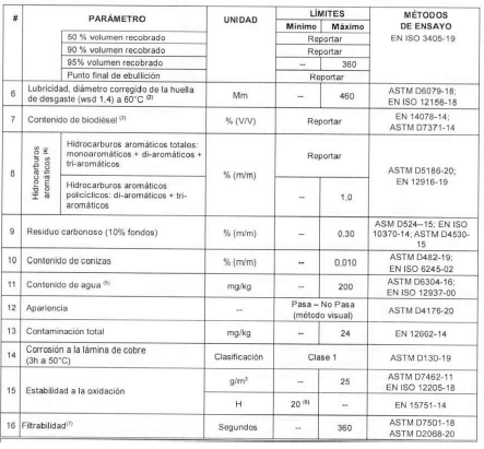 (6) Esta especificación deberá ser cumplida solo en caso de que el diésel renovable fuese utilizado puro como combustible para motores o vehículos diésel. Para el combustible diésel renovable que utilice FAME por encima de 2 % (V/V) como mejorador de lubricidad, este será un requerimiento adicional.