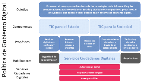 De acuerdo con el artículo 2.2.9.1.2.1 del Decreto 1078 de 2015, Decreto Único Reglamentario del Sector de Tecnologías de la Información y las Comunicaciones (DUR-TIC), “[l]a Política de Gobierno Digital se desarrollará a través de un esquema que articula los elementos que la componen, a saber: gobernanza, innovación pública digital, habilitadores, líneas de acción, e iniciativas dinamizadoras, con el fin de lograr su objetivo (…)”.